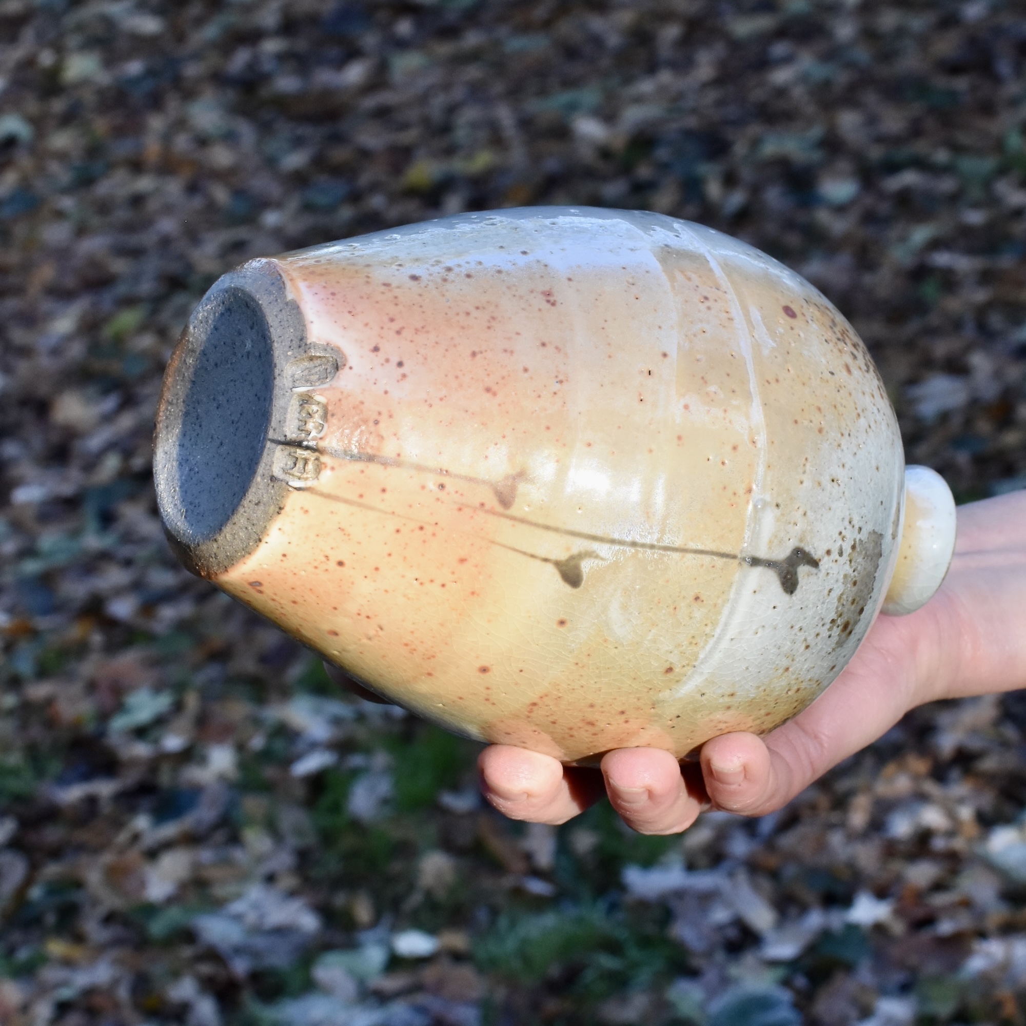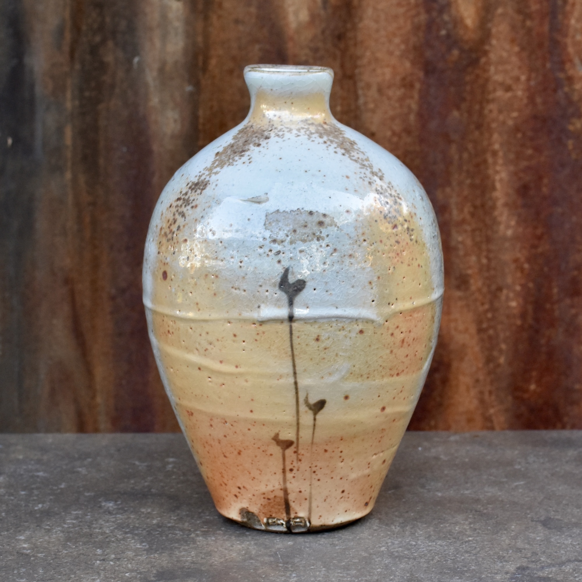 Bottle vase: wood fired stoneware with carbon trap shino glaze and iron slip brushwork.