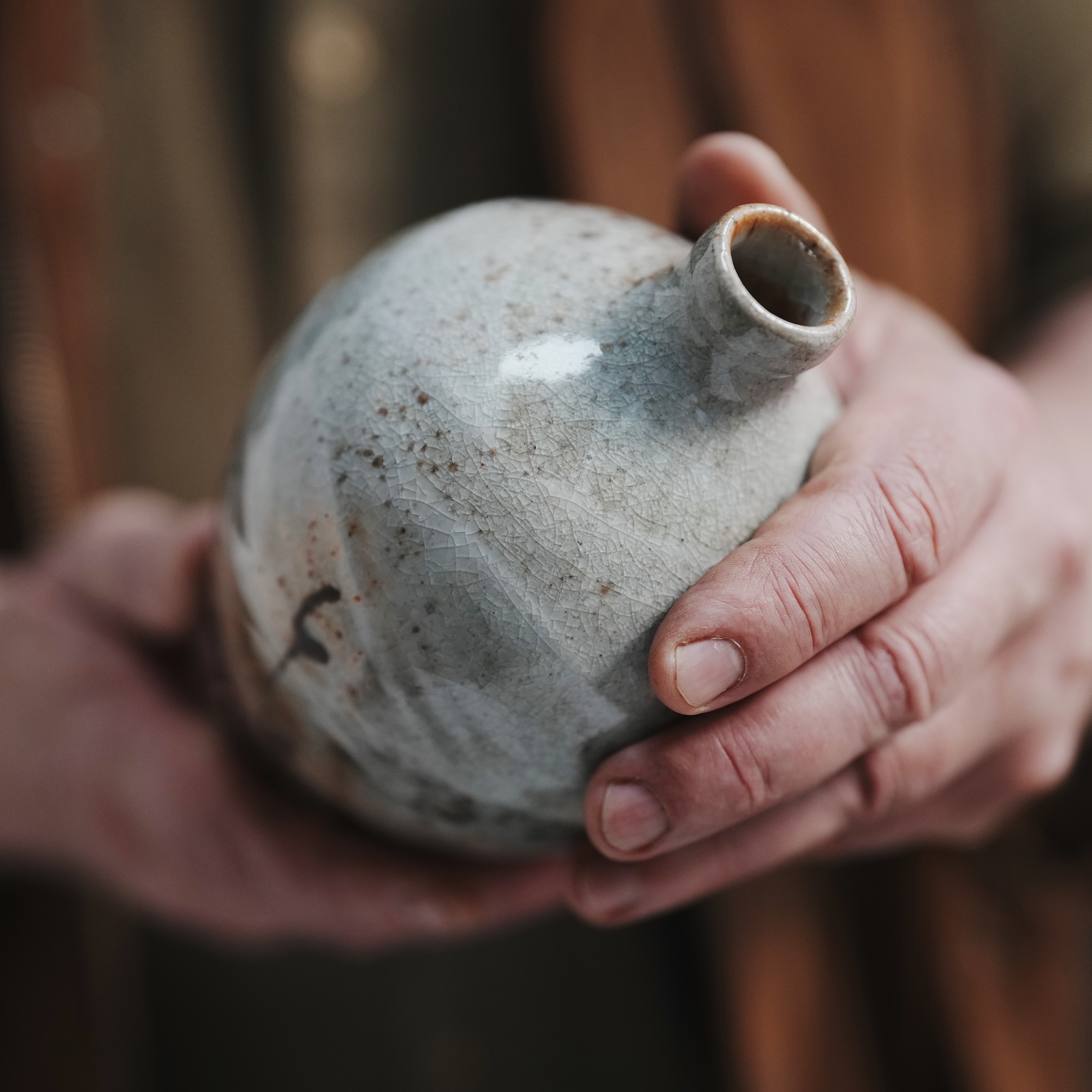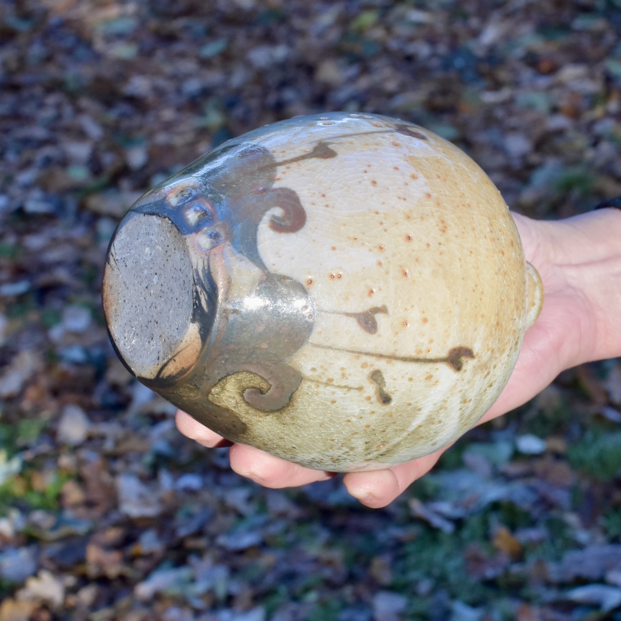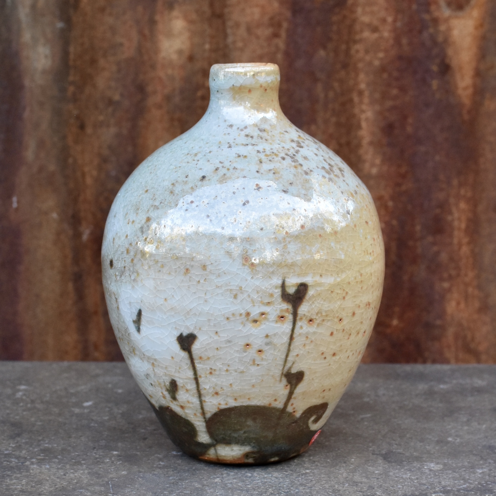 Small fat bottle vase: wood fired stoneware with carbon trap shino glaze and iron slip brushwork.