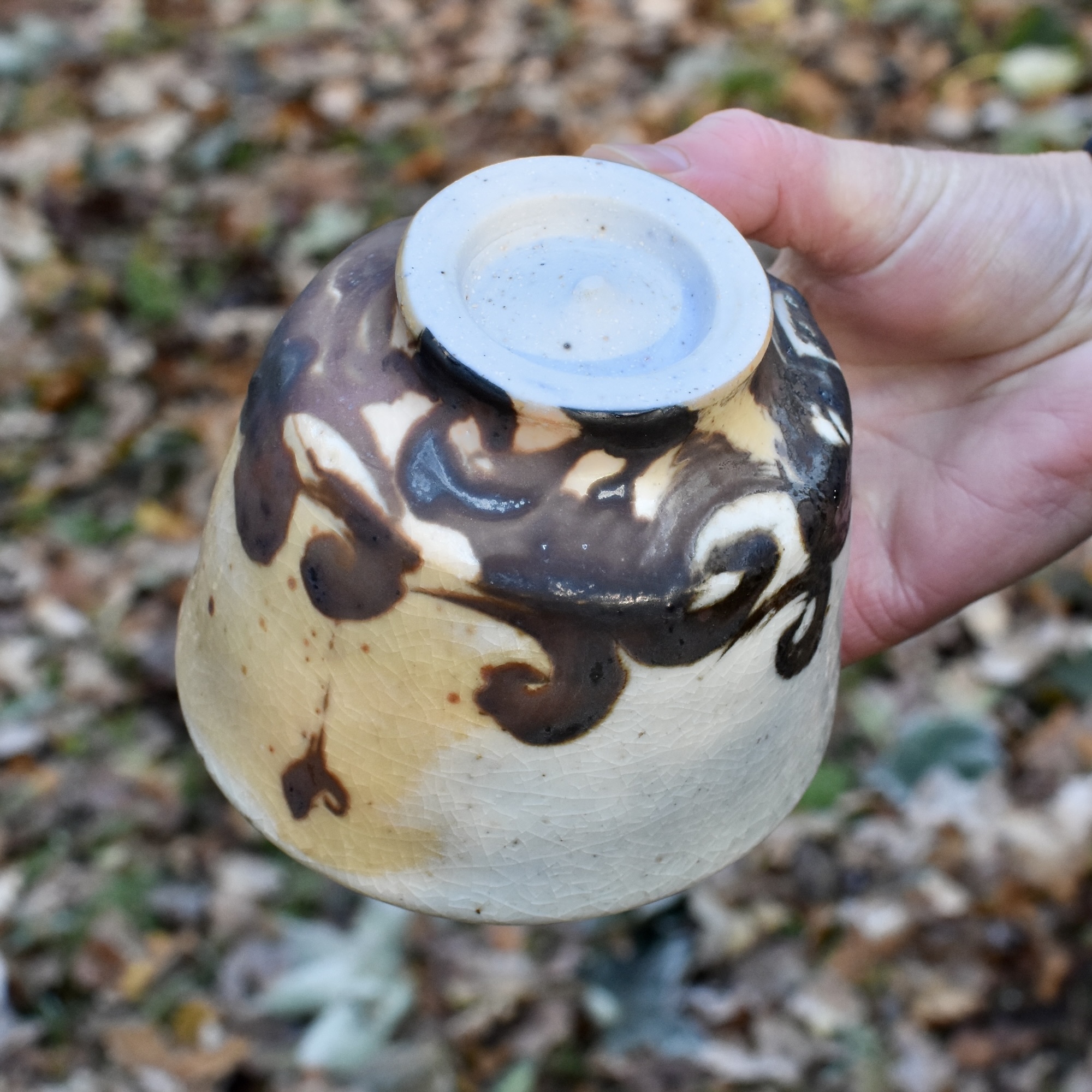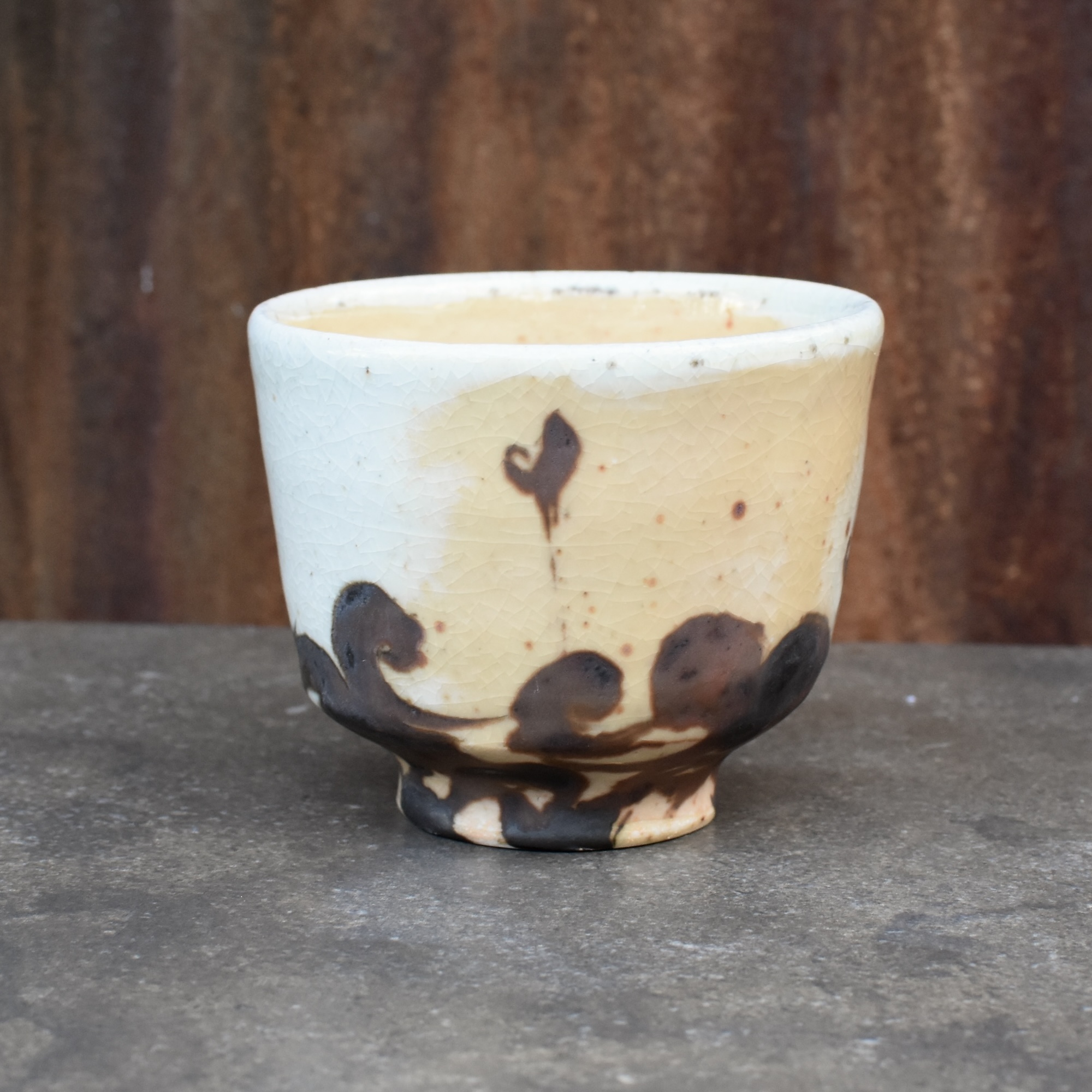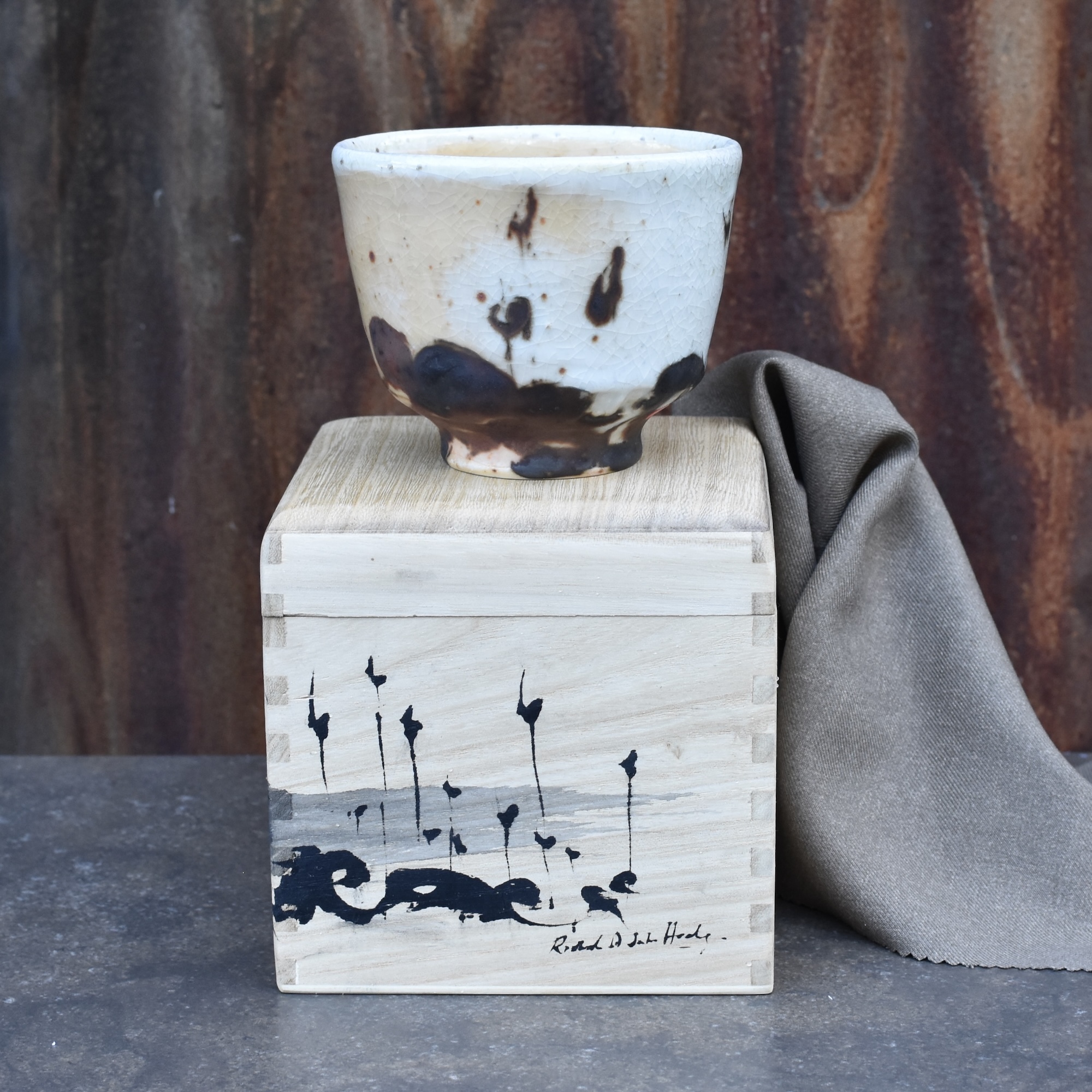Large teabowl: wood fired porcelain with shino glaze and iron slip brushwork. 9×11.5 cm With complementary hand-inked wooden box.