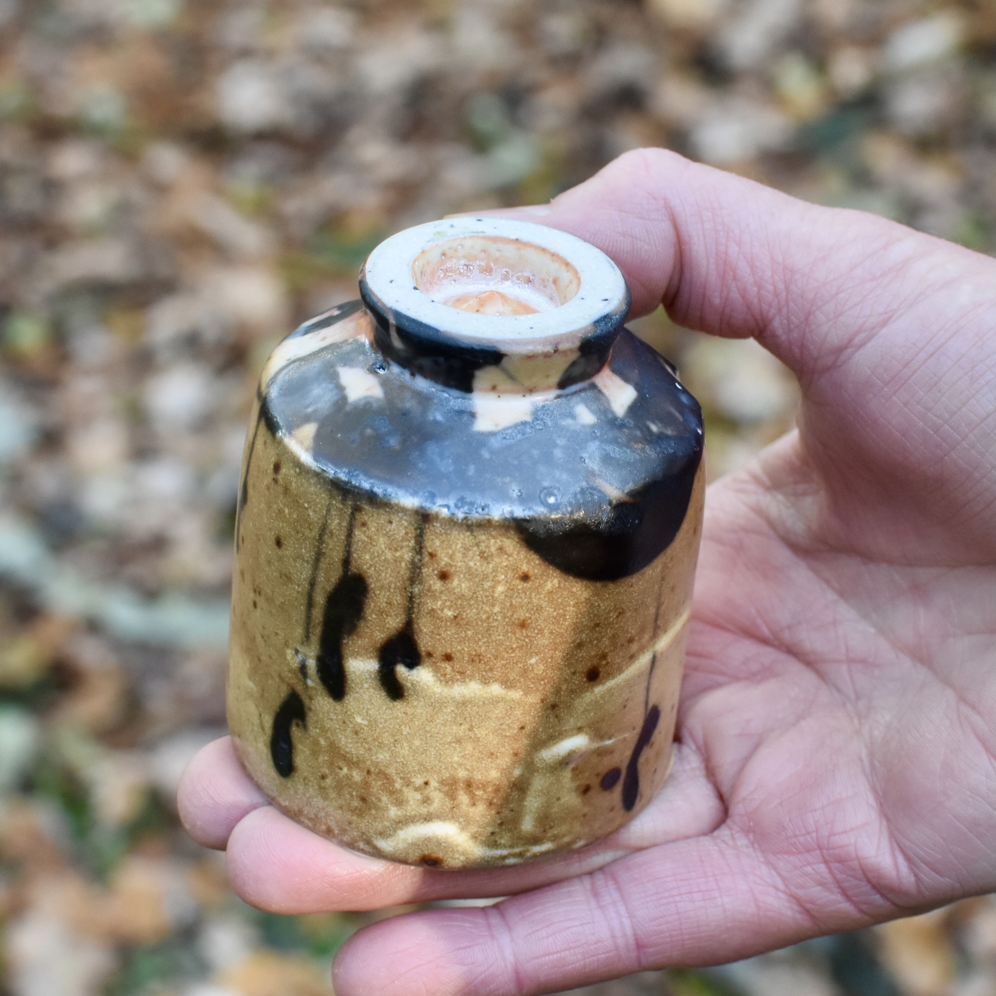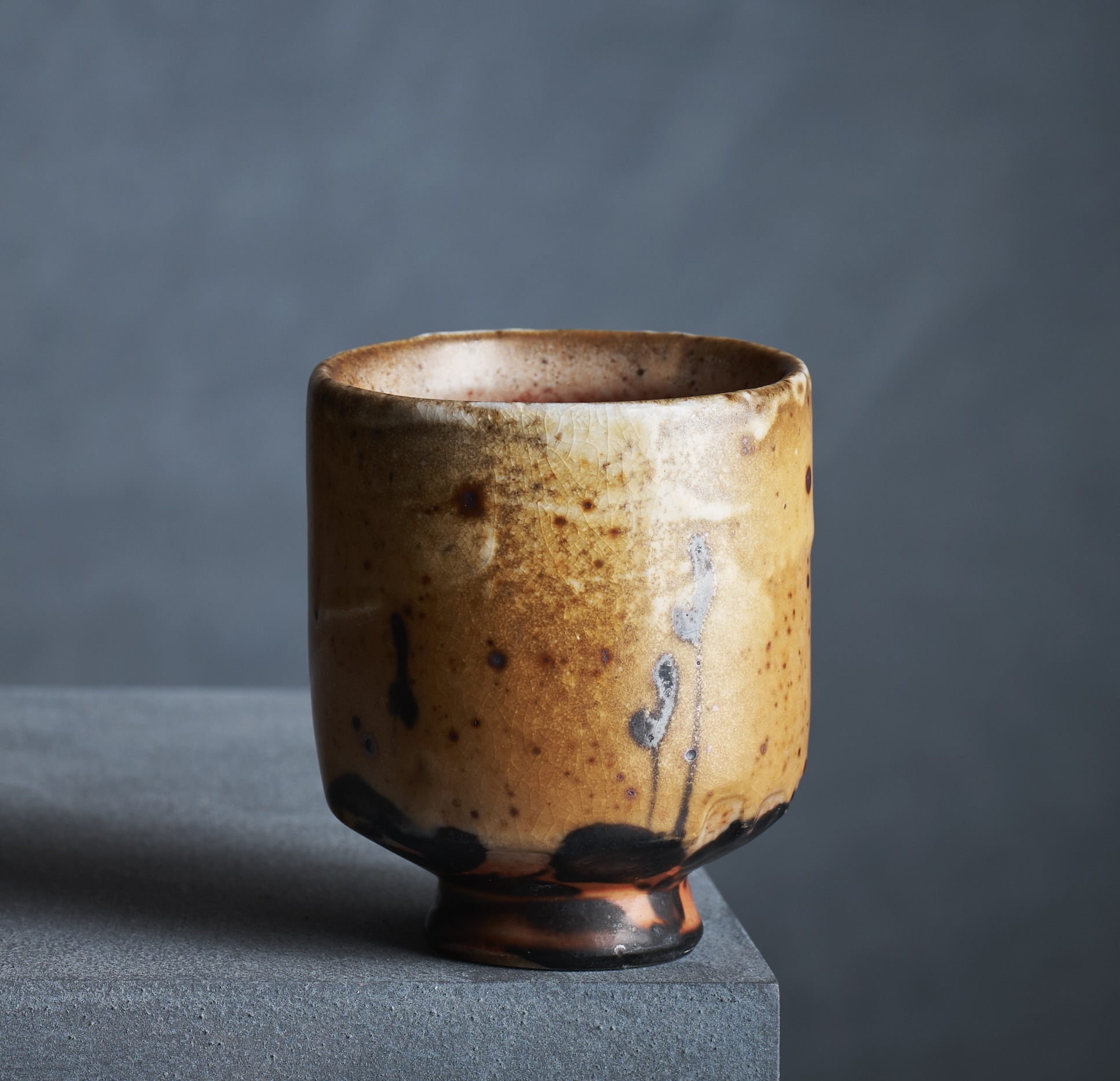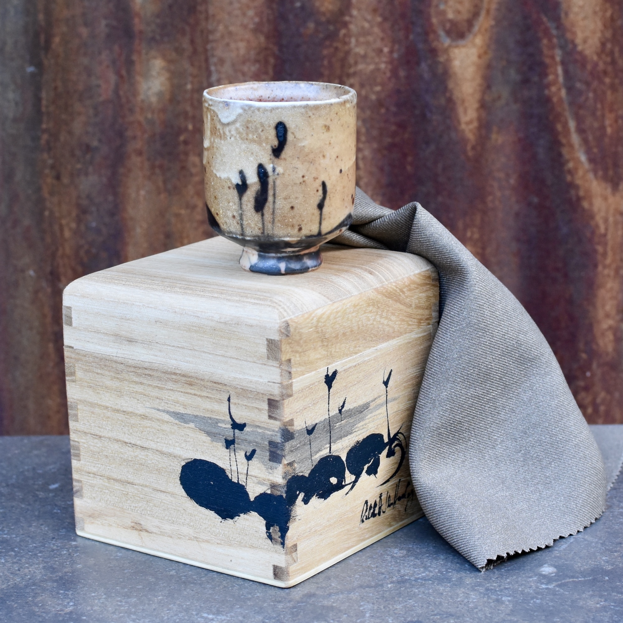 Small drinking cup: wood fired stoneware with gold shino glaze and iron slip brushwork. 7×6 cm With complementary hand-inked wooden box.