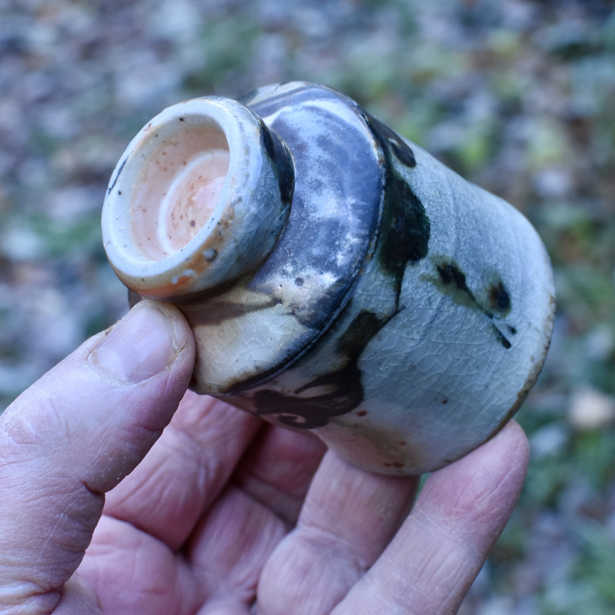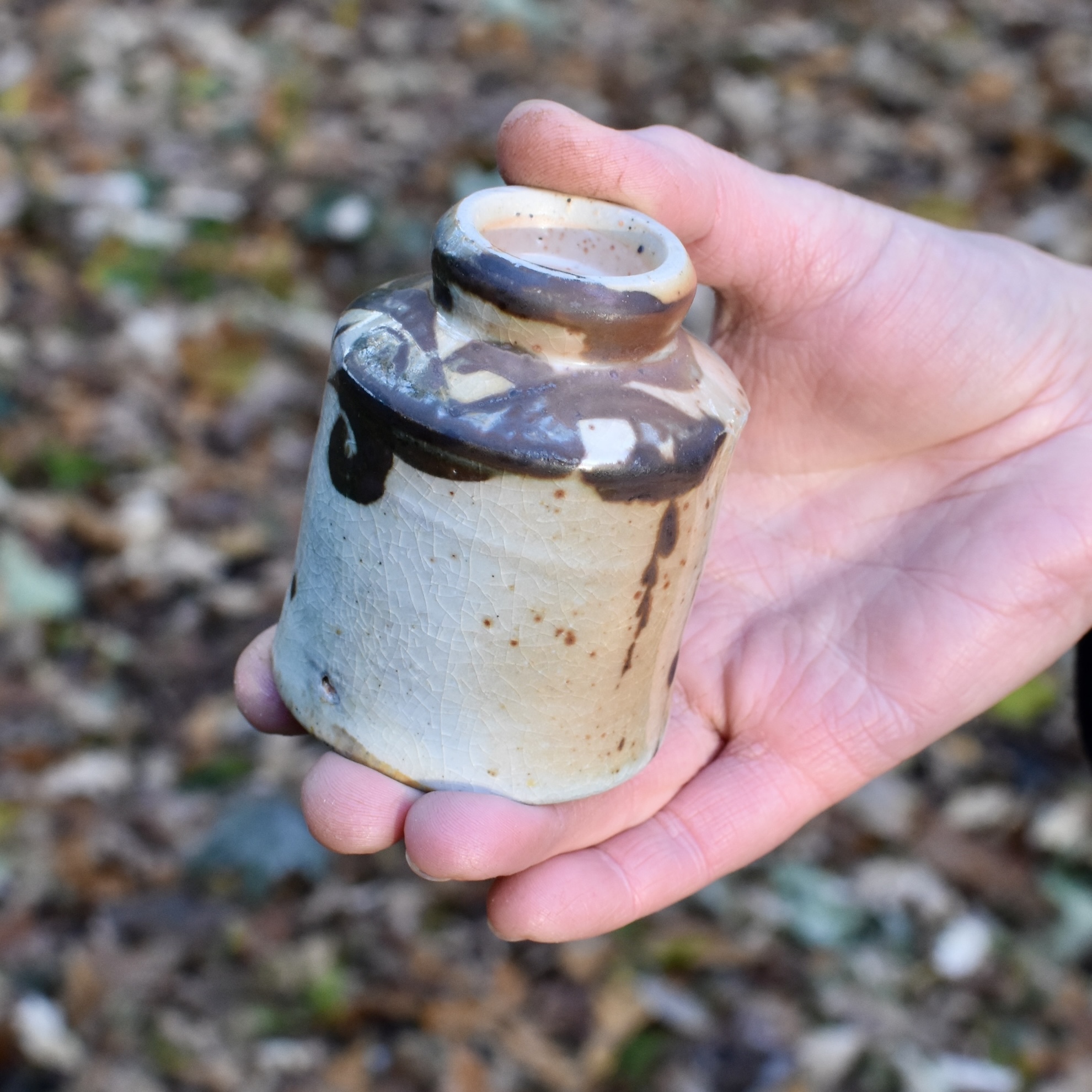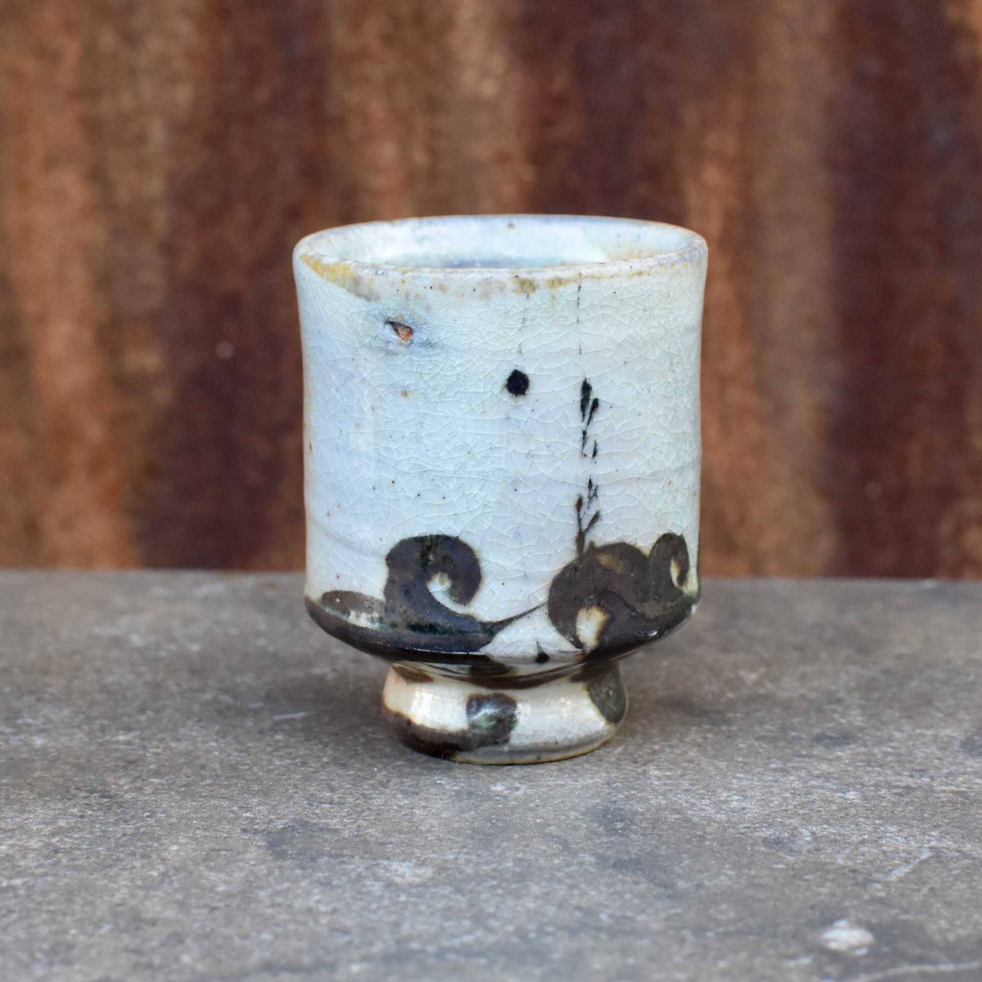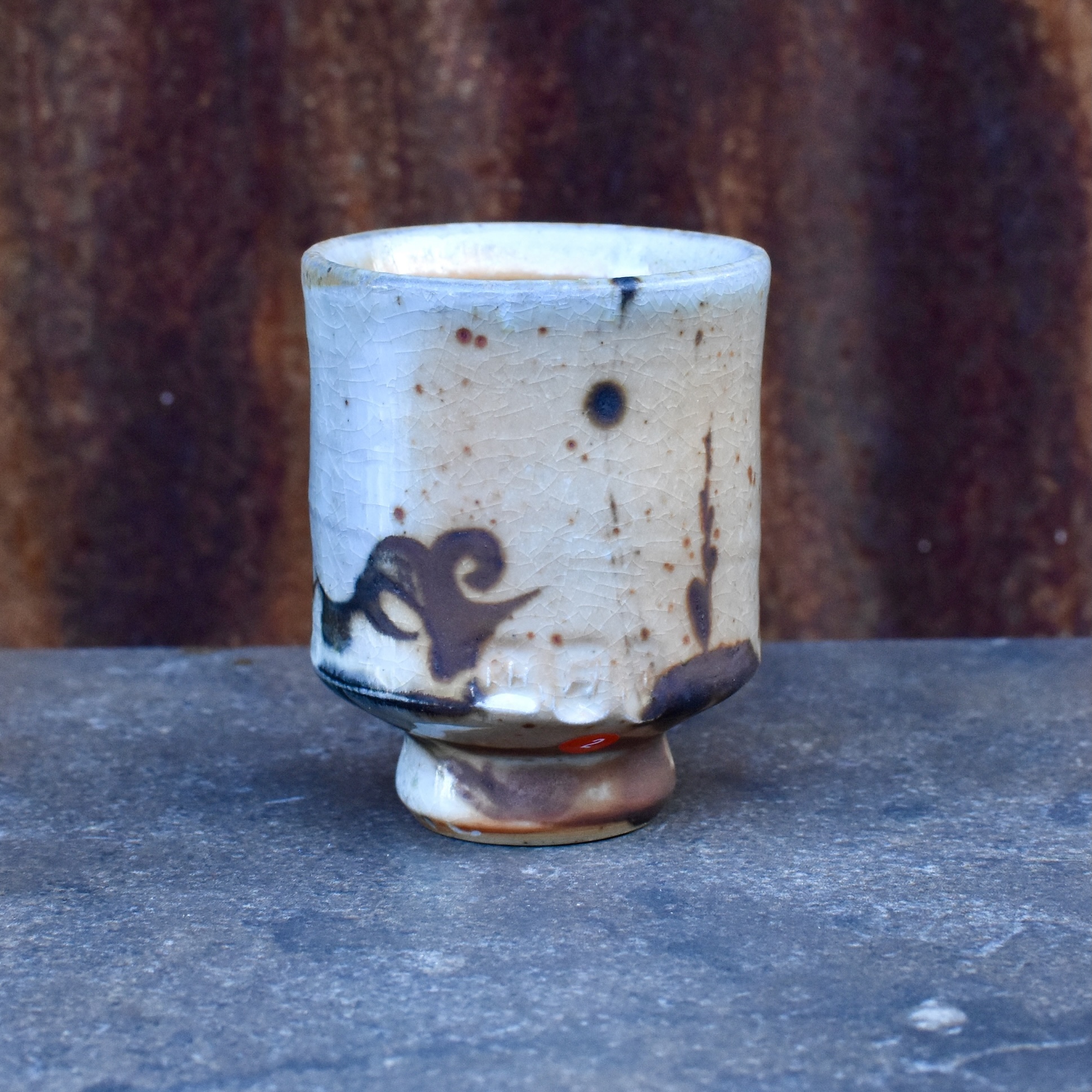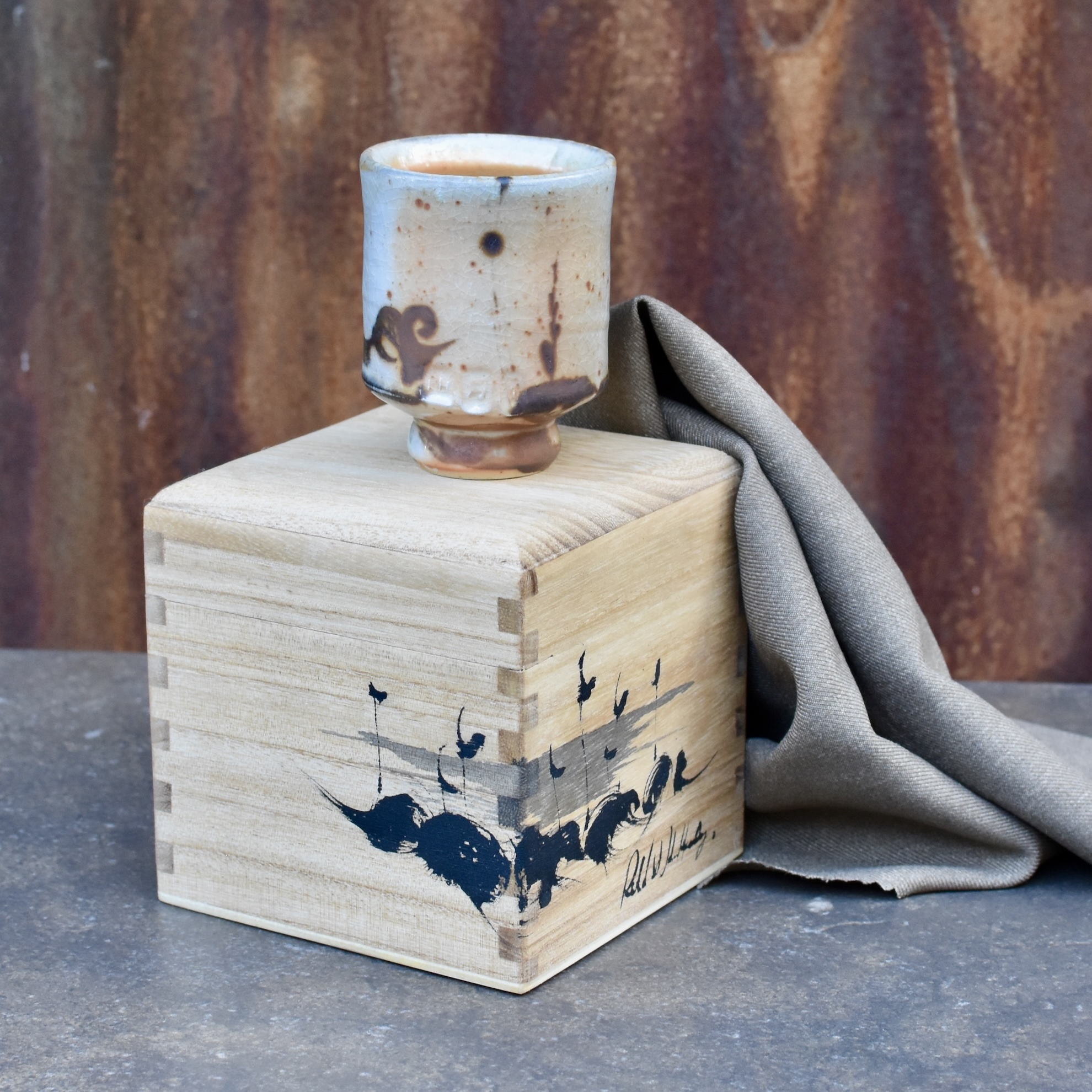 Small drinking cup: wood fired stoneware with gold shino glaze and iron slip brushwork. 8×6 cm With complementary hand-inked wooden box.