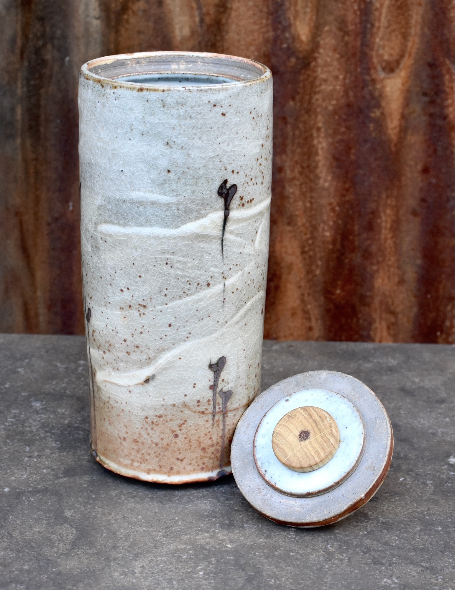 Wood fired stoneware with carbon trap shino glaze and iron slip brushwork.
