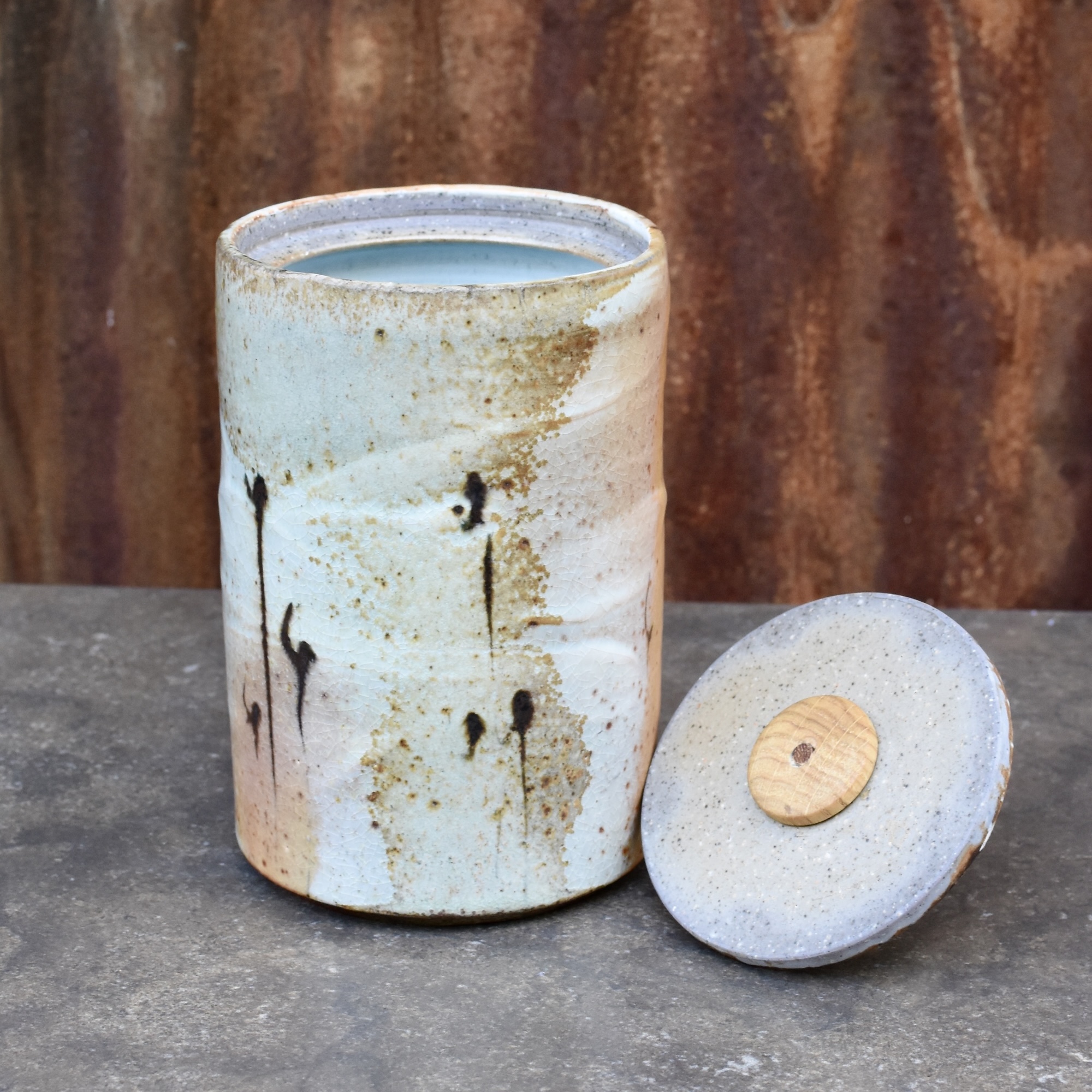 Wood fired stoneware with carbon trap shino glaze and iron slip brushwork.