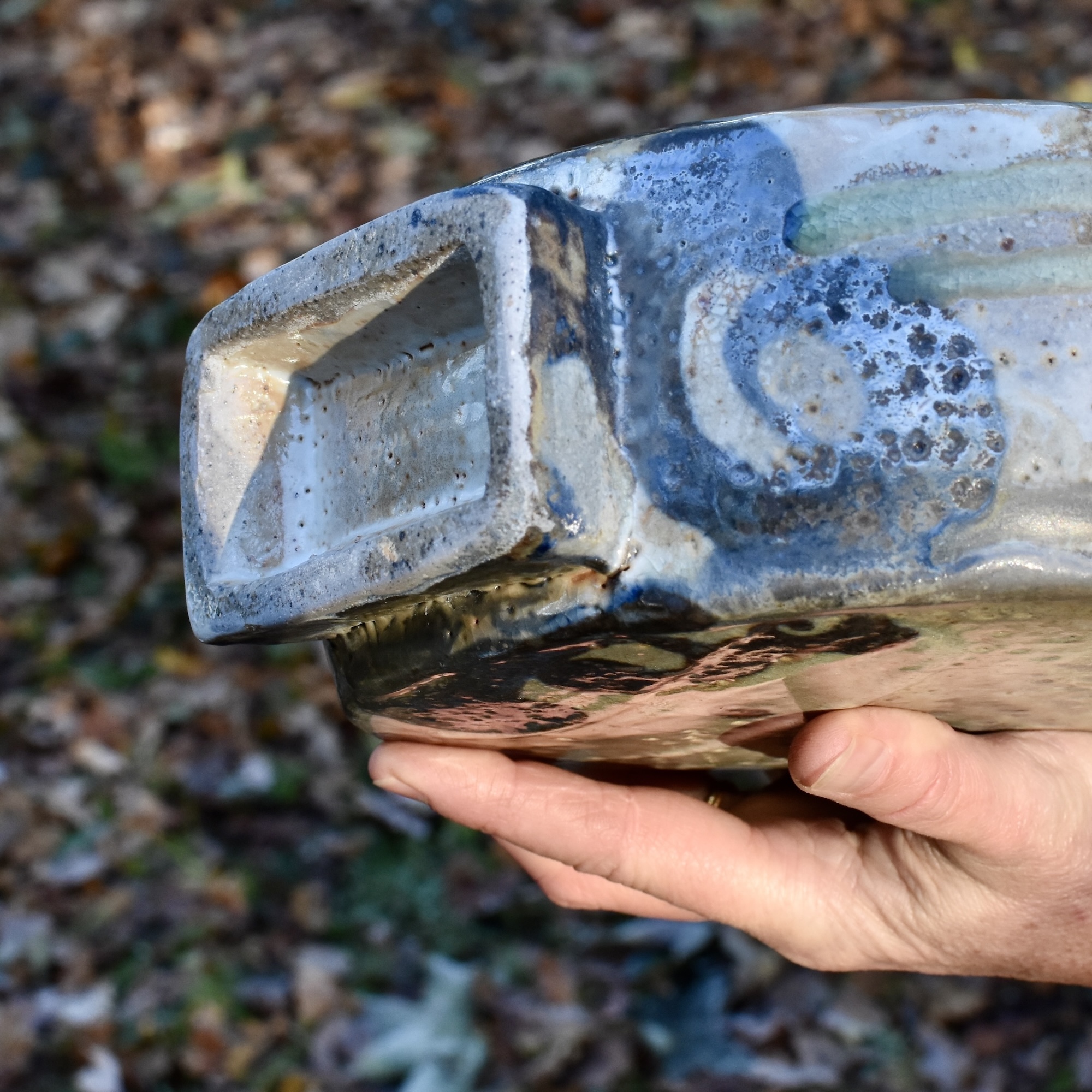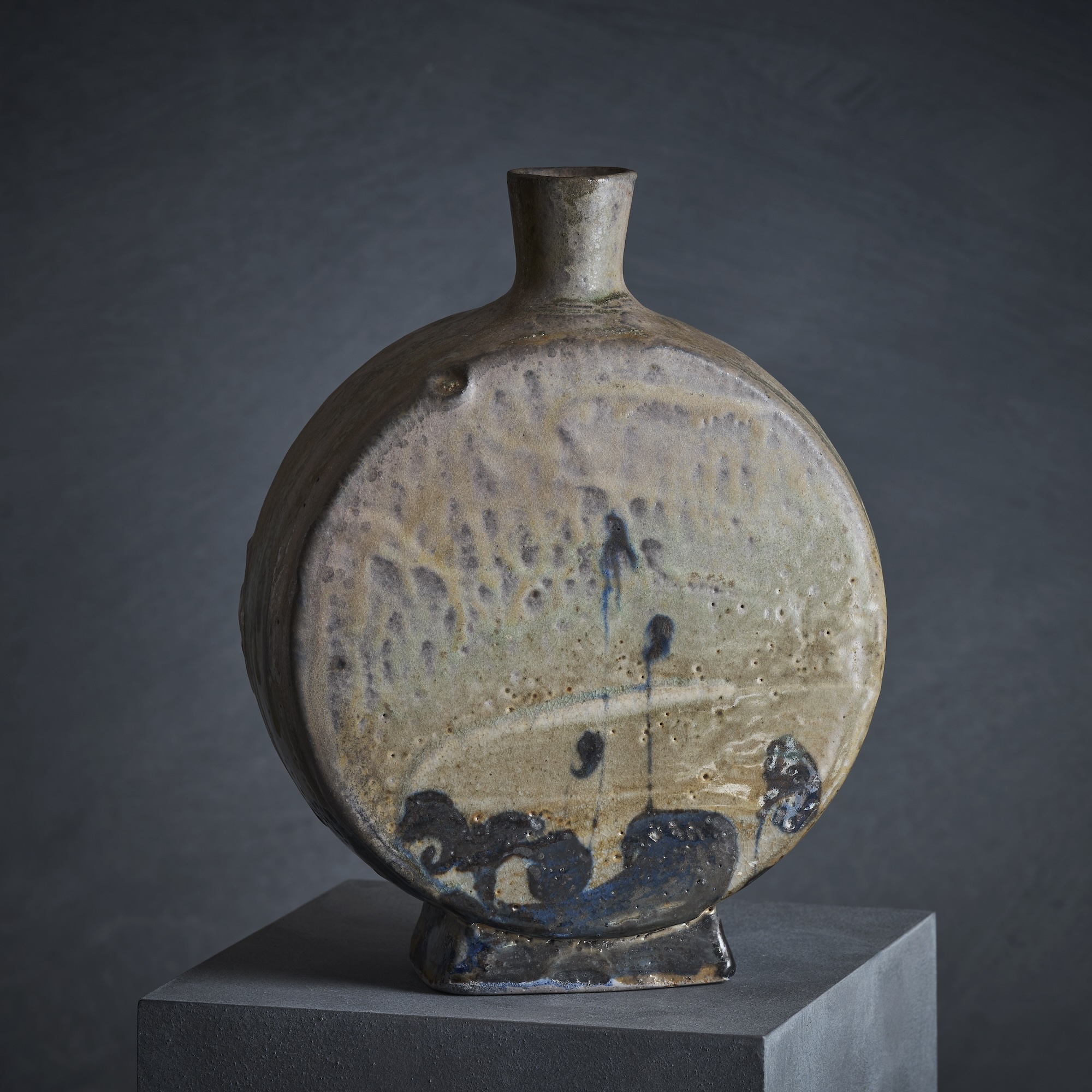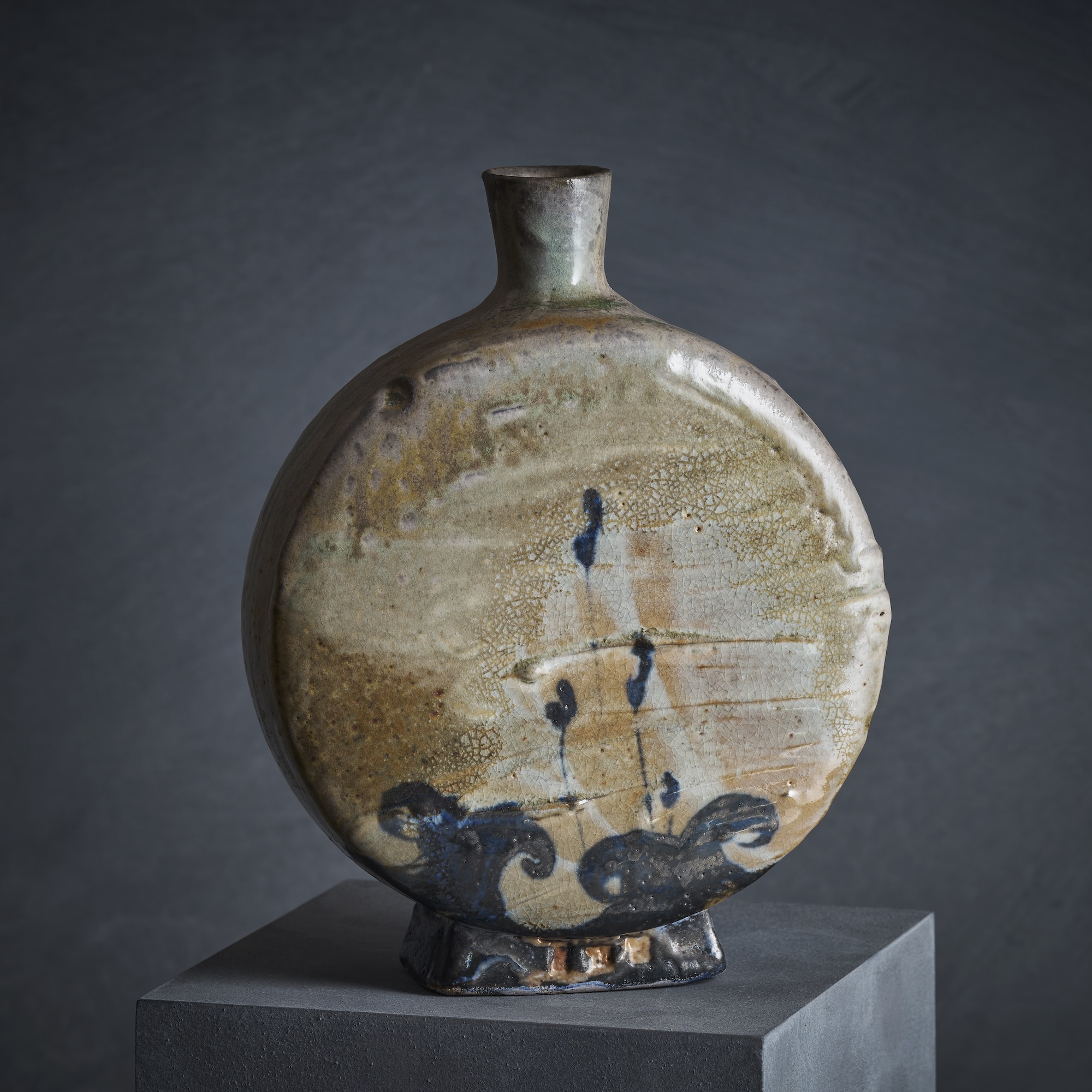 Bottle vase: wood fired stoneware with carbon trap shino glaze and iron slip brushwork. Heavy ashing. 25×19 cm