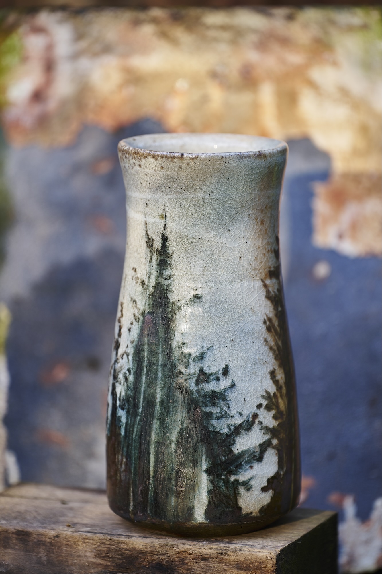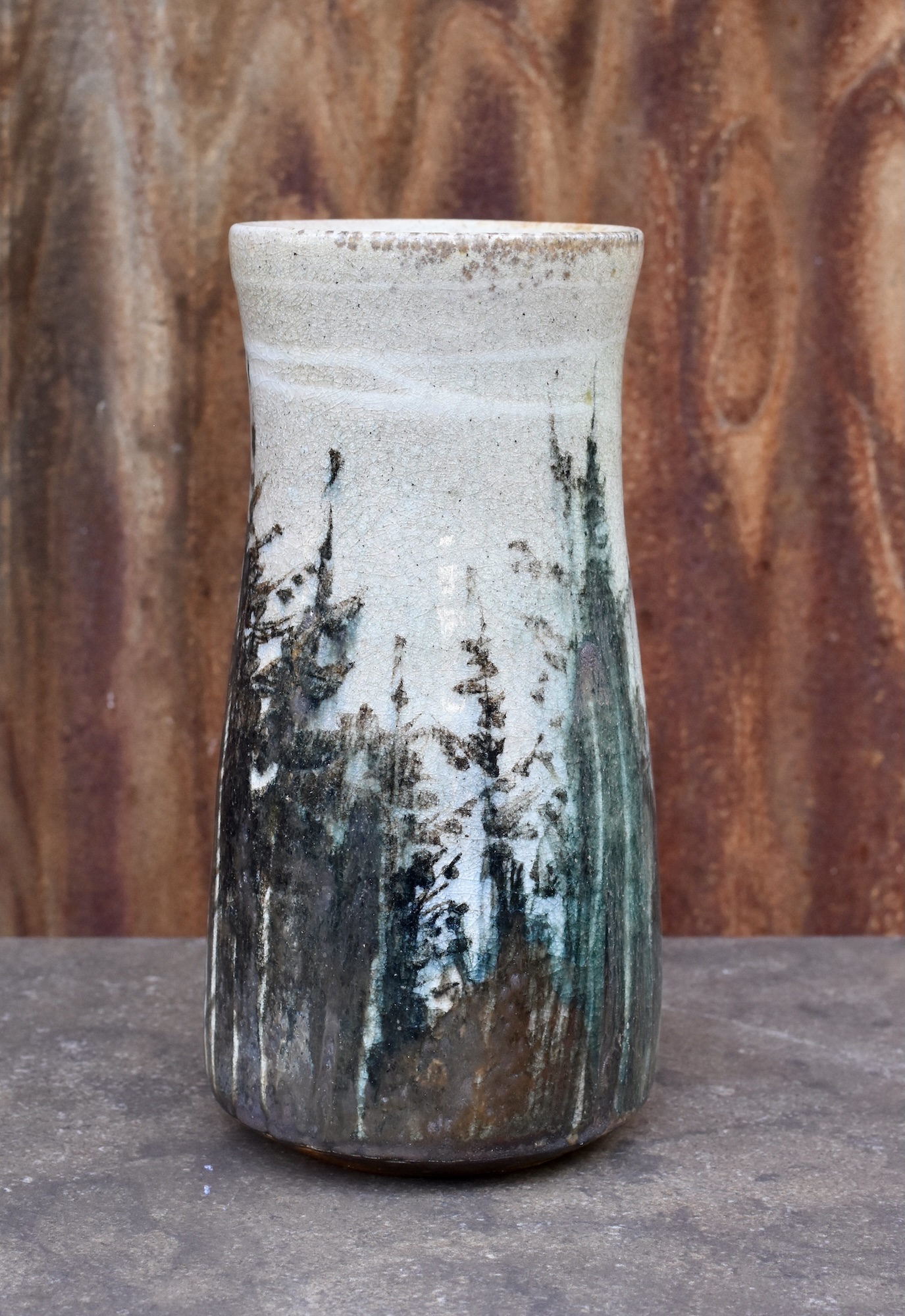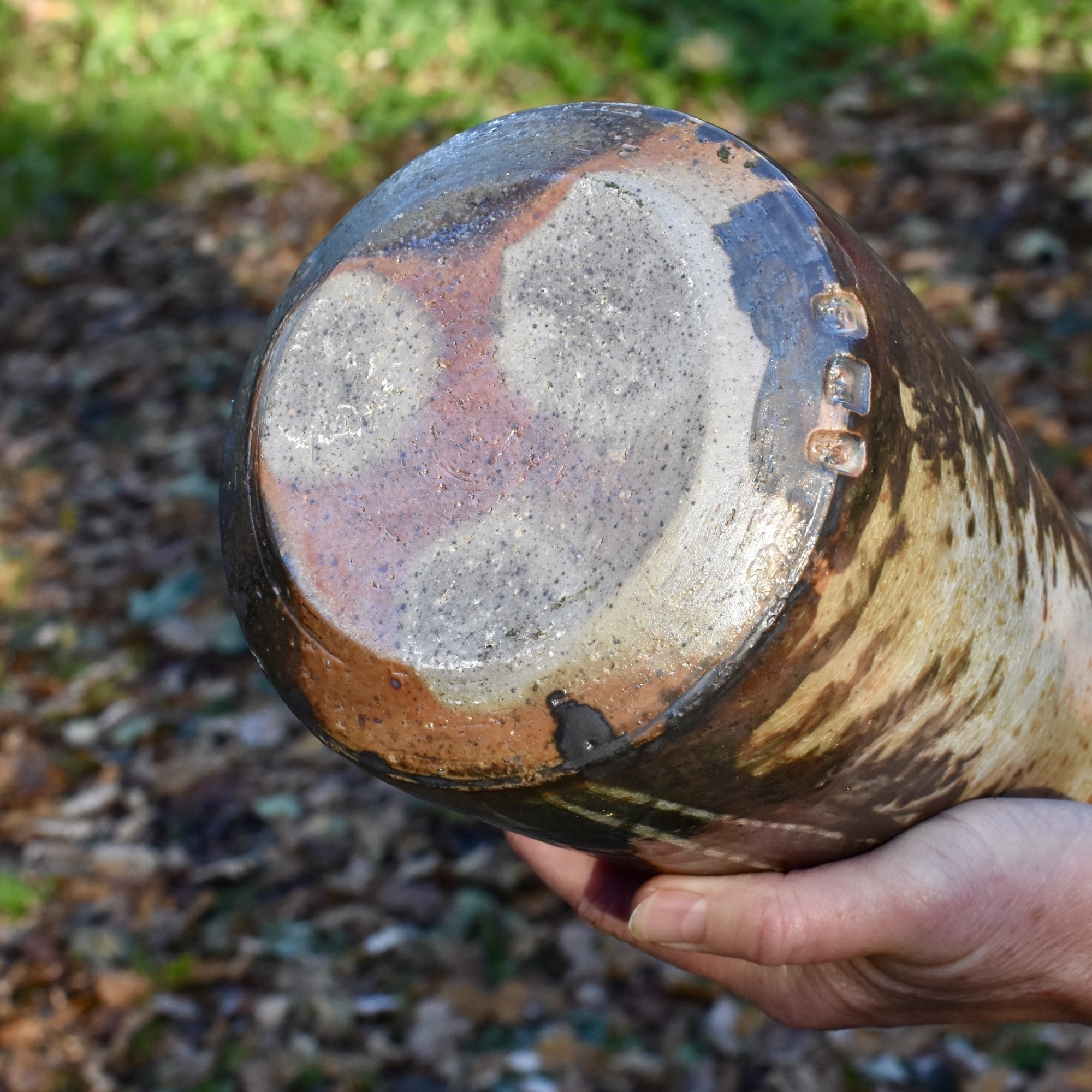 Bottle vase: wood fired stoneware with gold shino glaze and iron slip brushwork. 26×13.5 cm