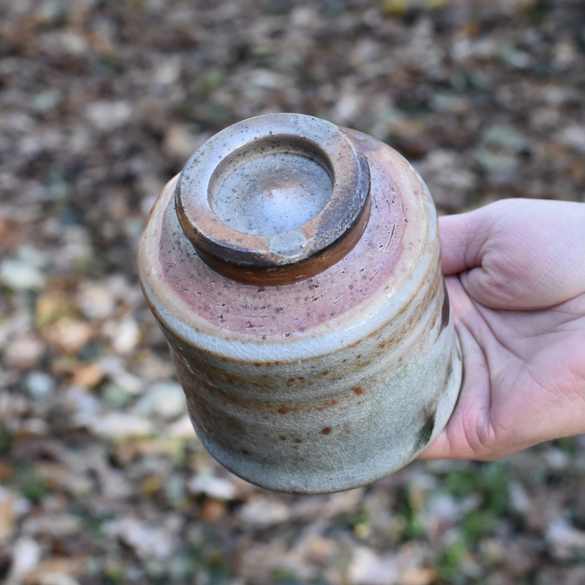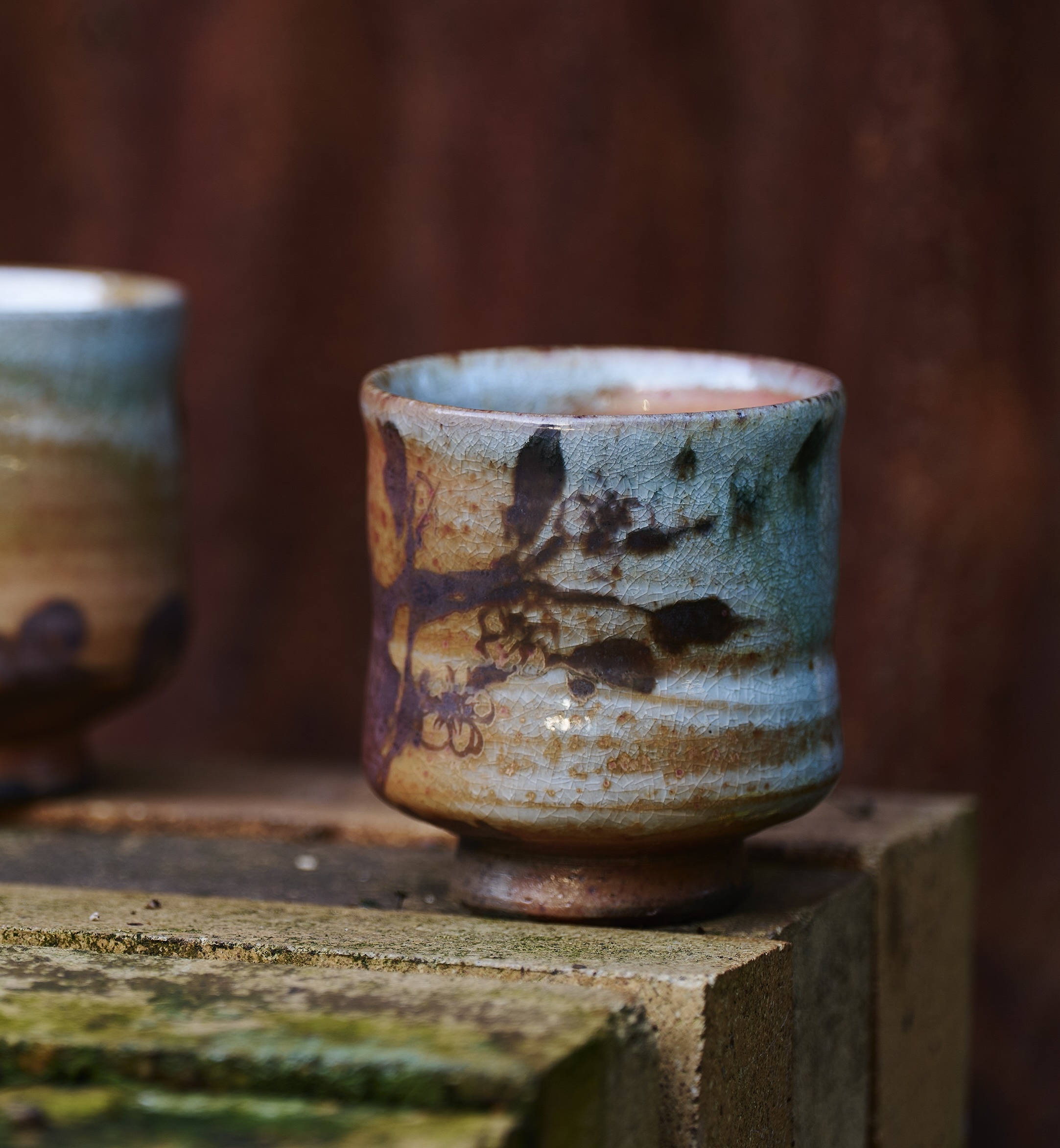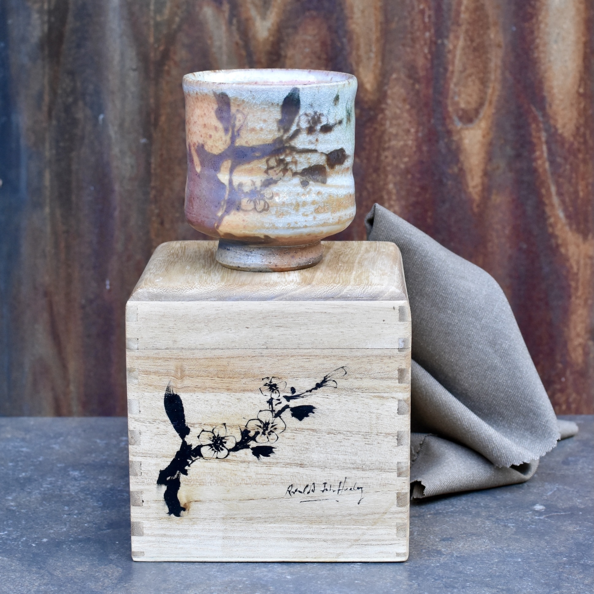 Drinking cup: wood fired stoneware with gold shino glaze and iron slip brushwork. 10×9 cm With complementary hand-inked wooden box.