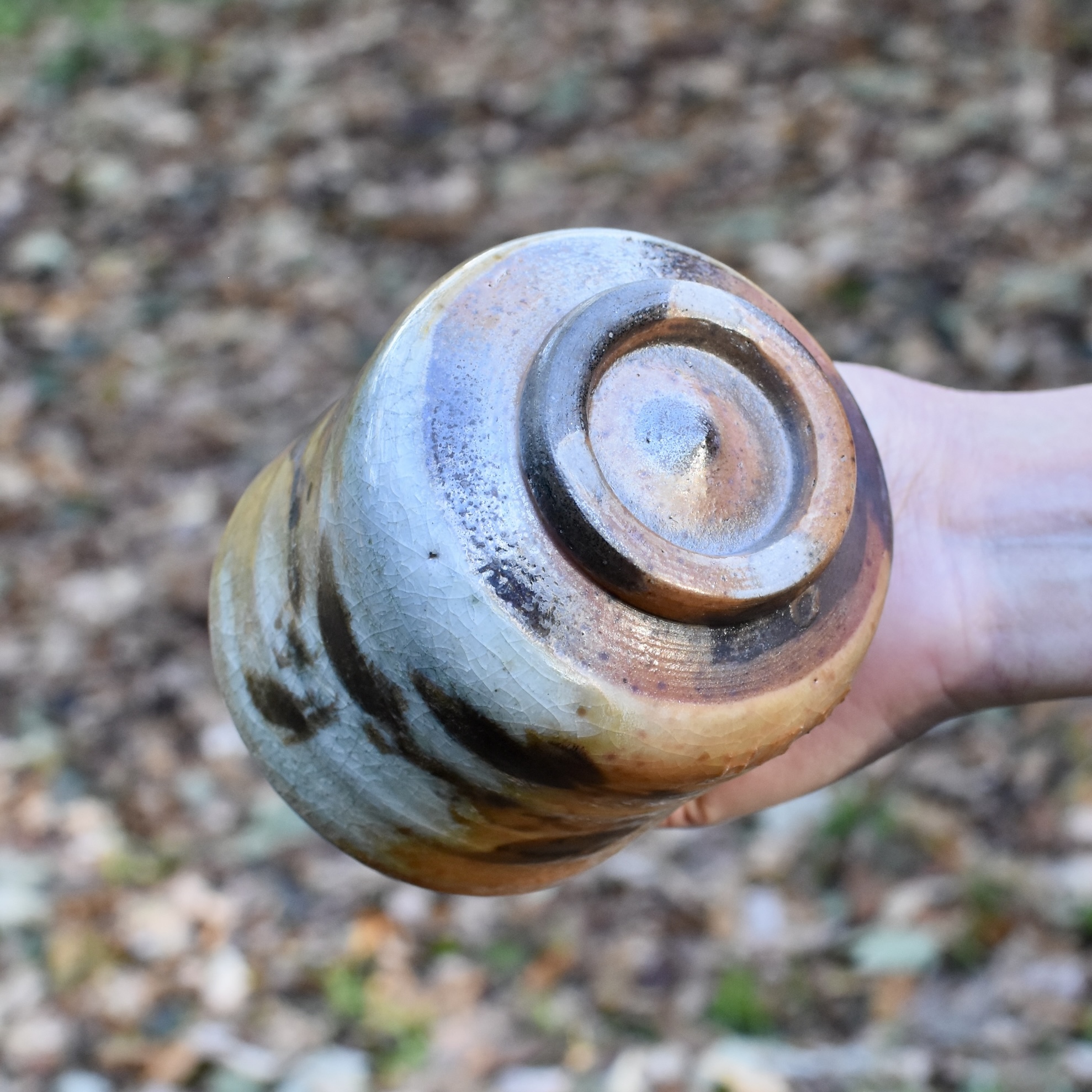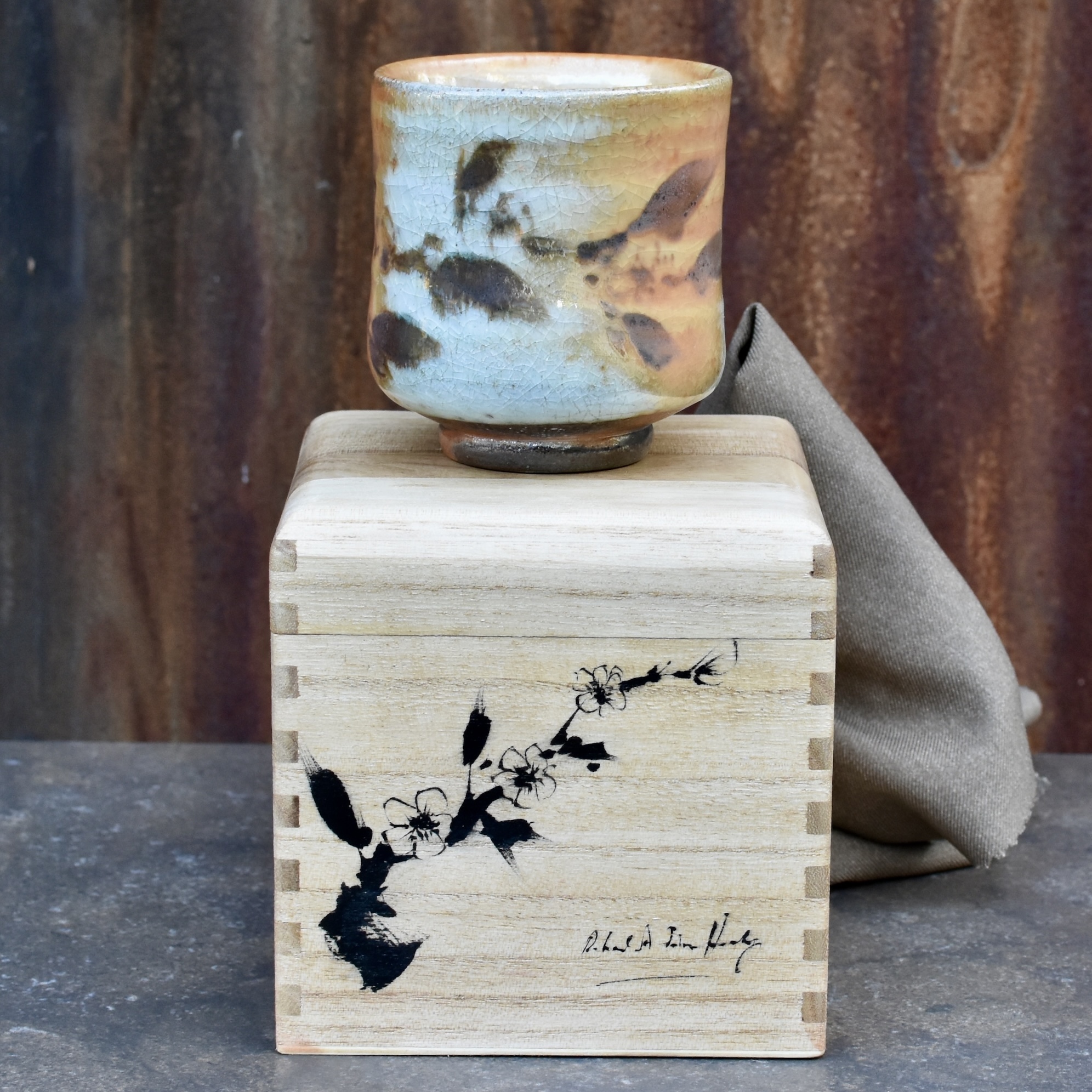 Drinking cup: wood fired stoneware with gold shino glaze and iron slip brushwork. 10×9 cm With complementary hand-inked wooden box.